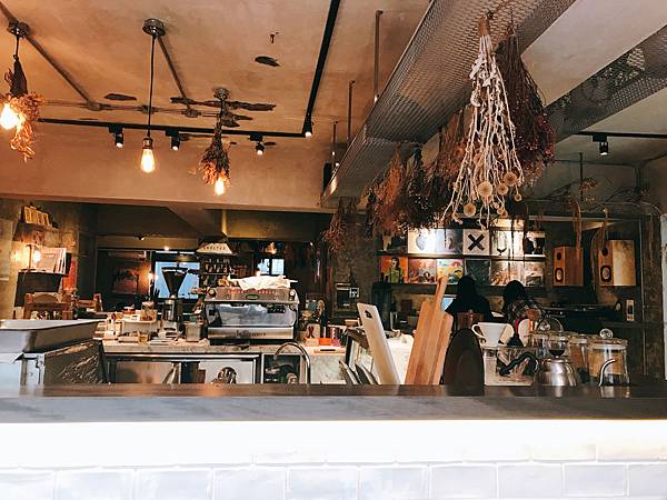 很喜歡這個工作的吧台,店內有很多乾燥花,和電影海報,黑膠唱片裝飾!